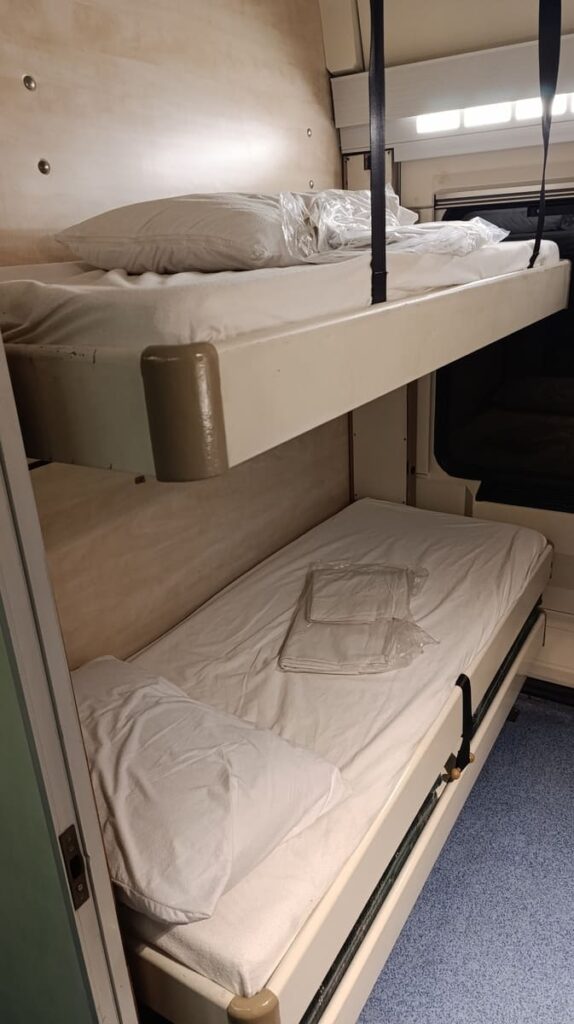 Couchette carriages have no sink inside and no table. The bunk beds are slightly smaller than in the coupé.