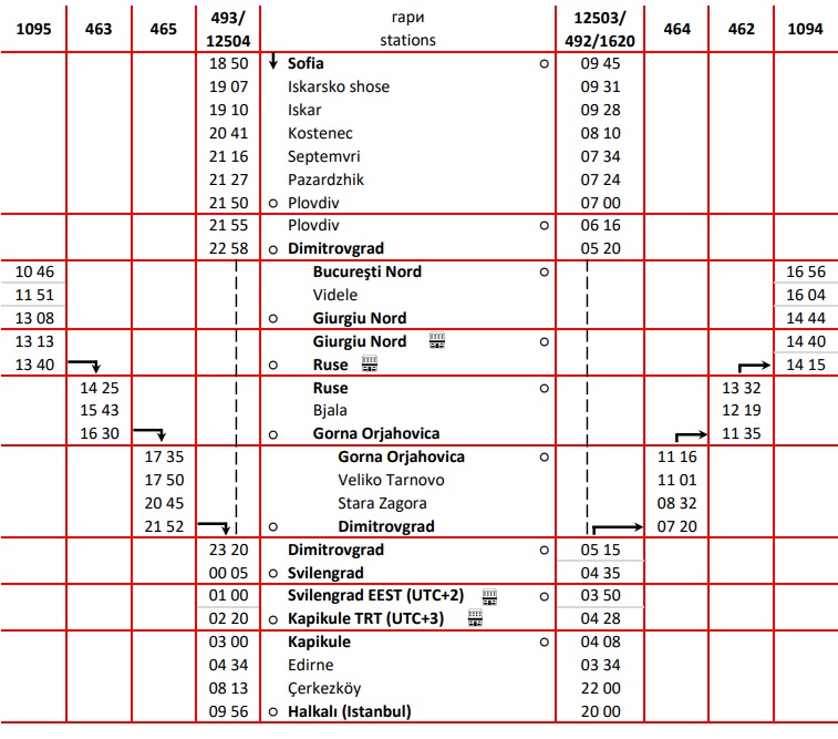 Note that Bulgaria observes daylight saving time from October to March, whereas Türkiye does not, so there is 1 hour difference between the two countries during the winter, hence the different departure times in Sofia but the same arrival time in Istanbul.